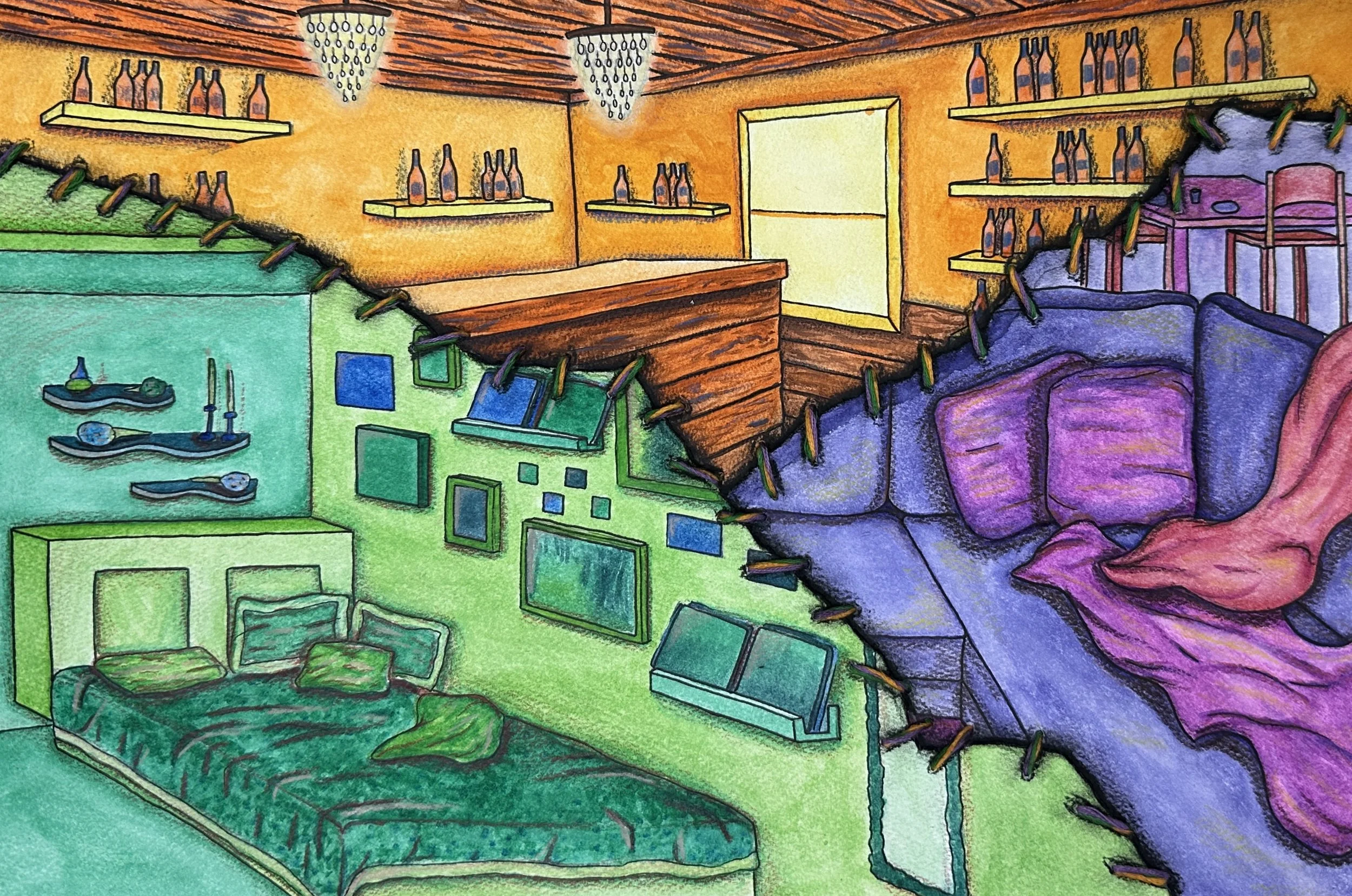 I embarked on a sustained investigation where I explored what defines “home”. I’ve moved several times, and have struggled to understand where on the spectrum between my physical and social environments I believe “home” is. I used 2D art as a method of finding the balance between physical and social environments, so that I can answer my question of: “What is home?
